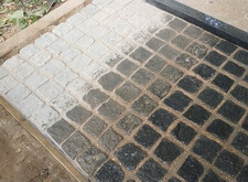 Засыпаем брусчатку пескобетоном, снимаем лишний слой, замываем.